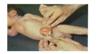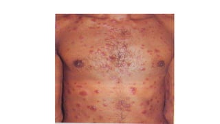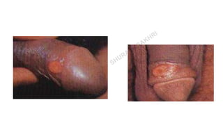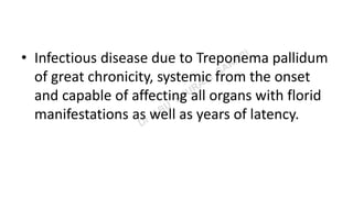 This document provides information about syphilis, caused by the spiral bacteria Treponema pallidum. It can affect all organs and cause a variety of manifestations. Syphilis is classified as either acquired or congenital. Acquired syphilis progresses through primary, secondary, early latent, and late stages. Primary syphilis causes painless ulcers. Secondary syphilis presents with rashes and mucous membrane lesions. Tertiary syphilis can cause gummas or damage to internal organs. Neurosyphilis can also occur. Congenital syphilis is transmitted from mother to child and can cause early symptoms or late complications if untreated. Diagnosis involves blood and CSF tests. Treatment depends on the
