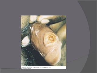 Syphilis is caused by the bacterium Treponema pallidum and is transmitted sexually, from mother to fetus, or rarely by other means. It progresses through primary, secondary, latent, and late stages if left untreated. Primary syphilis presents as a chancre which can spread to nearby lymph nodes. Secondary syphilis causes a rash and mucous membrane lesions. Latent syphilis involves positive blood tests without symptoms. Late syphilis can damage internal organs like the heart, brain, and skin in the form of gummas. Syphilis screening and treatment are important to prevent transmission and complications. Congenital syphilis is transmitted from mother to fetus and can cause serious lifelong effects if
