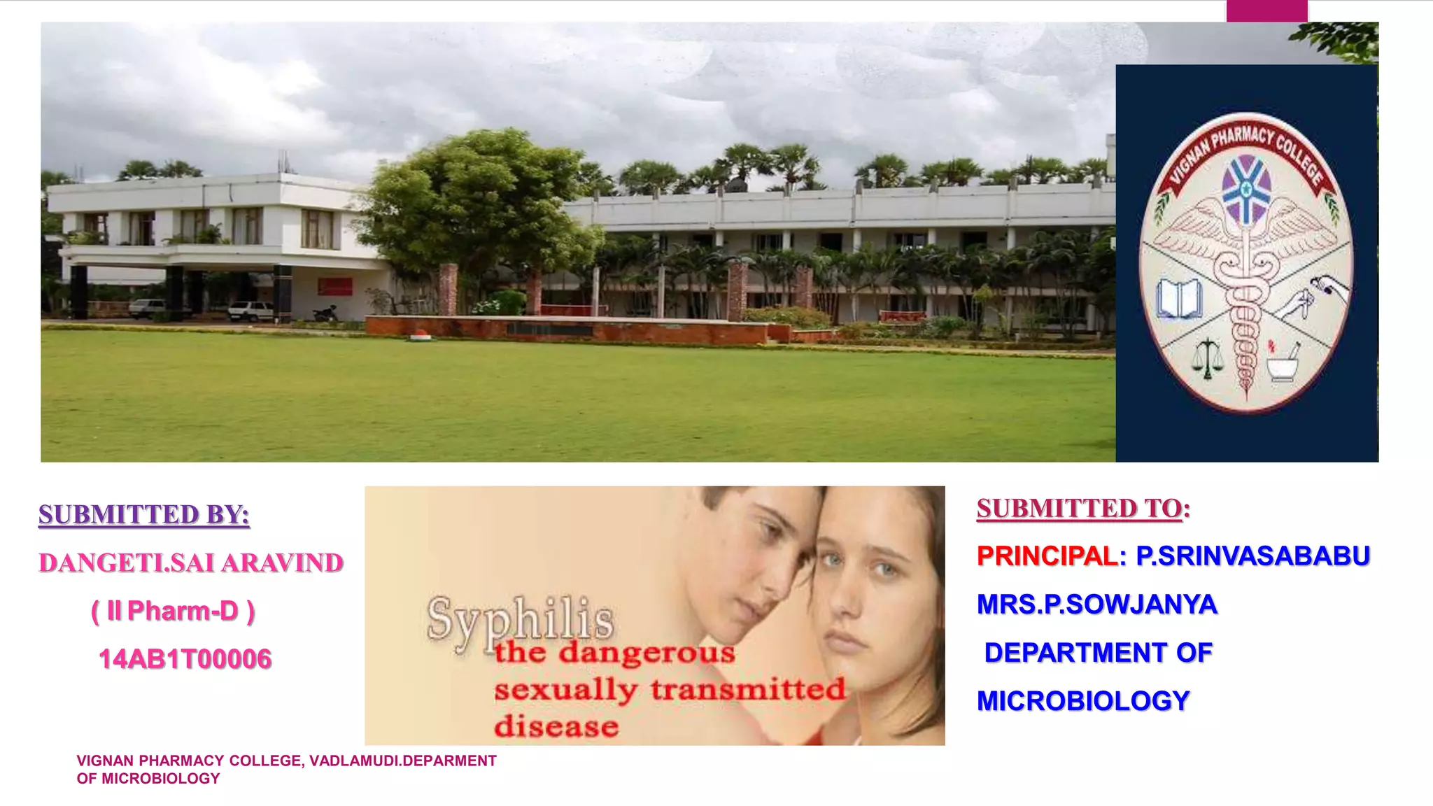 1) Syphilis is a chronic sexually transmitted disease caused by the spirochete Treponema pallidum. It progresses through primary, secondary, latent, and tertiary stages if left untreated.