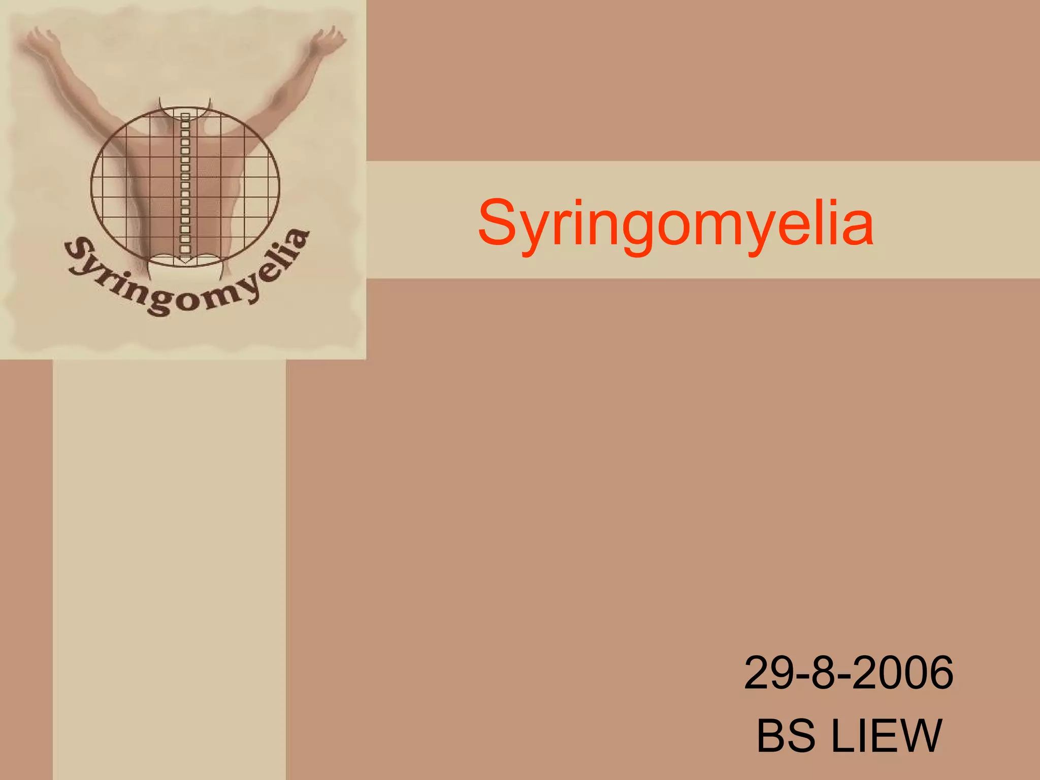 This document provides an overview of syringomyelia, including its pathogenesis, pathology, classification, clinical features, and natural history. Syringomyelia is a condition characterized by fluid-filled cavities within the spinal cord. It most commonly affects the cervical and thoracic regions. Clinical features include pain and sensory loss. The natural history varies, but symptoms typically progress slowly over years, with some patients experiencing stabilization or spontaneous resolution in rare cases.