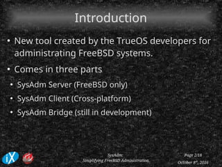 SysAdm is a new tool created by TrueOS developers for administering FreeBSD systems. It consists of a SysAdm Server that runs on FreeBSD, a cross-platform SysAdm Client, and a bridge (still in development). The server facilitates interactions between the user and system directly without an internal database. The client allows graphically managing multiple servers with features like package management, firewall configuration, and system monitoring. Both components use encryption and authentication to communicate securely. SysAdm aims to simplify administration tasks without replacing traditional SSH/terminal access.