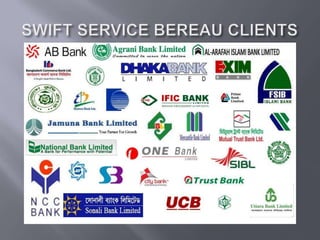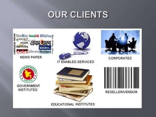 This document provides information on outsourcing and consultancy services offered by a company including Swift service bureau services provided to 31 banks, desktop maintenance and support, network design and implementation, problem diagnosis and solutions. It also lists three clients: Shishu Bikash Kendra, Dayton Holdings Ltd., and Shahik Securities Ltd and positions the company as a partner for outsourcing needs.