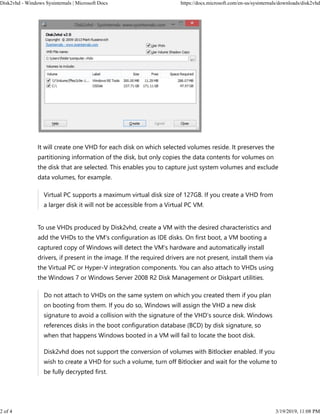 Disk2vhd is a utility that creates virtual hard disk (VHD) images of physical disks that can be used in Virtual PC or Hyper-V virtual machines. It uses Windows' Volume Snapshot capability to capture consistent snapshots of selected volumes while the system remains online. Disk2vhd preserves disk partitioning and copies data from selected volumes to individual VHDs for each disk. It supports command line usage to script the creation of VHDs from specified volumes.