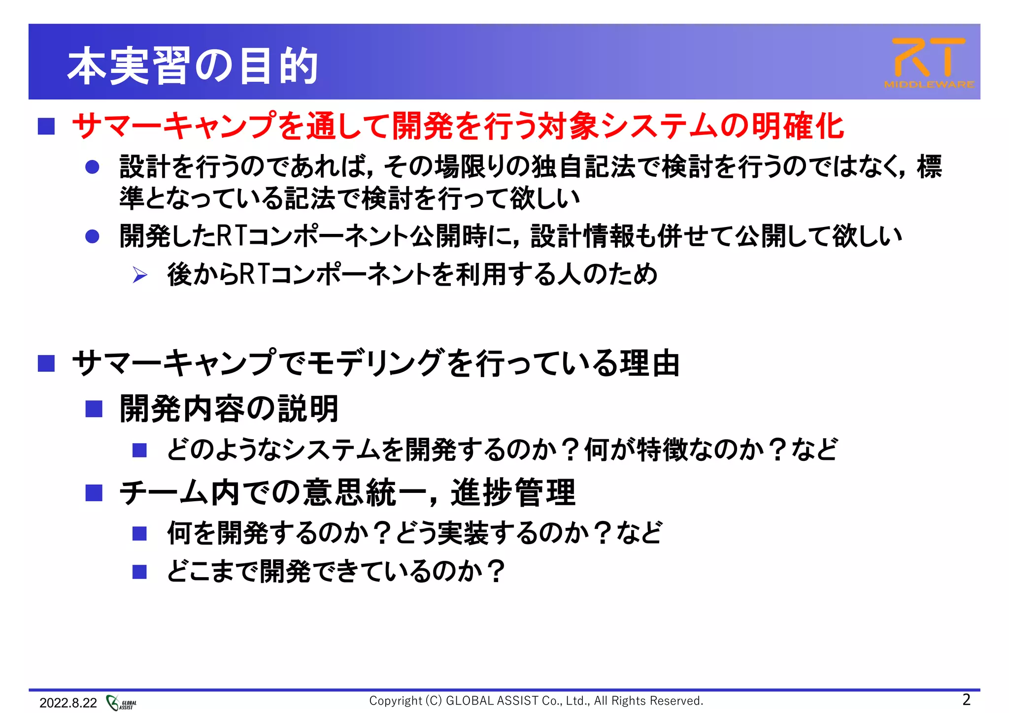 GLOBAL ASSIST Co., Ltd., All Rights Reserved. 2 本実習の目的 サマーキャンプを通して開発を行う対象システムの明確化 設計を行うのであれば,その場限りの独自記法で検討を行うのではなく,標 準となっている記法で検討を行って欲しい 開発したRTコンポーネント公開時に,設計情報も併せて公開して欲しい 後からRTコンポーネントを利用する人のため サマーキャンプでモデリングを行っている理由 開発内容の説明 どのようなシステムを開発するのか?何が特徴なのか?など チーム内での意思統一,進捗管理 何を開発するのか?どう実装するのか?など どこまで開発できているのか?