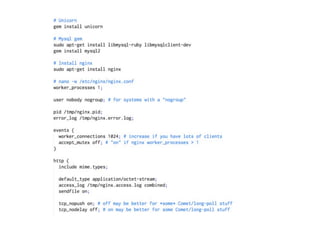 Chef is a systems integration framework that can be used to automate cloud infrastructure. It defines infrastructure as code and allows for repeatable configuration. Chef works by having a central Chef server that manages nodes. Nodes check in with the server to sync cookbooks, which contain recipes, definitions, and other configuration details. This ensures all nodes remain in the desired state defined in the cookbooks. A simple way to try Chef is by using Vagrant with Chef Solo, which allows setting up and configuring a virtual development environment on your local machine.