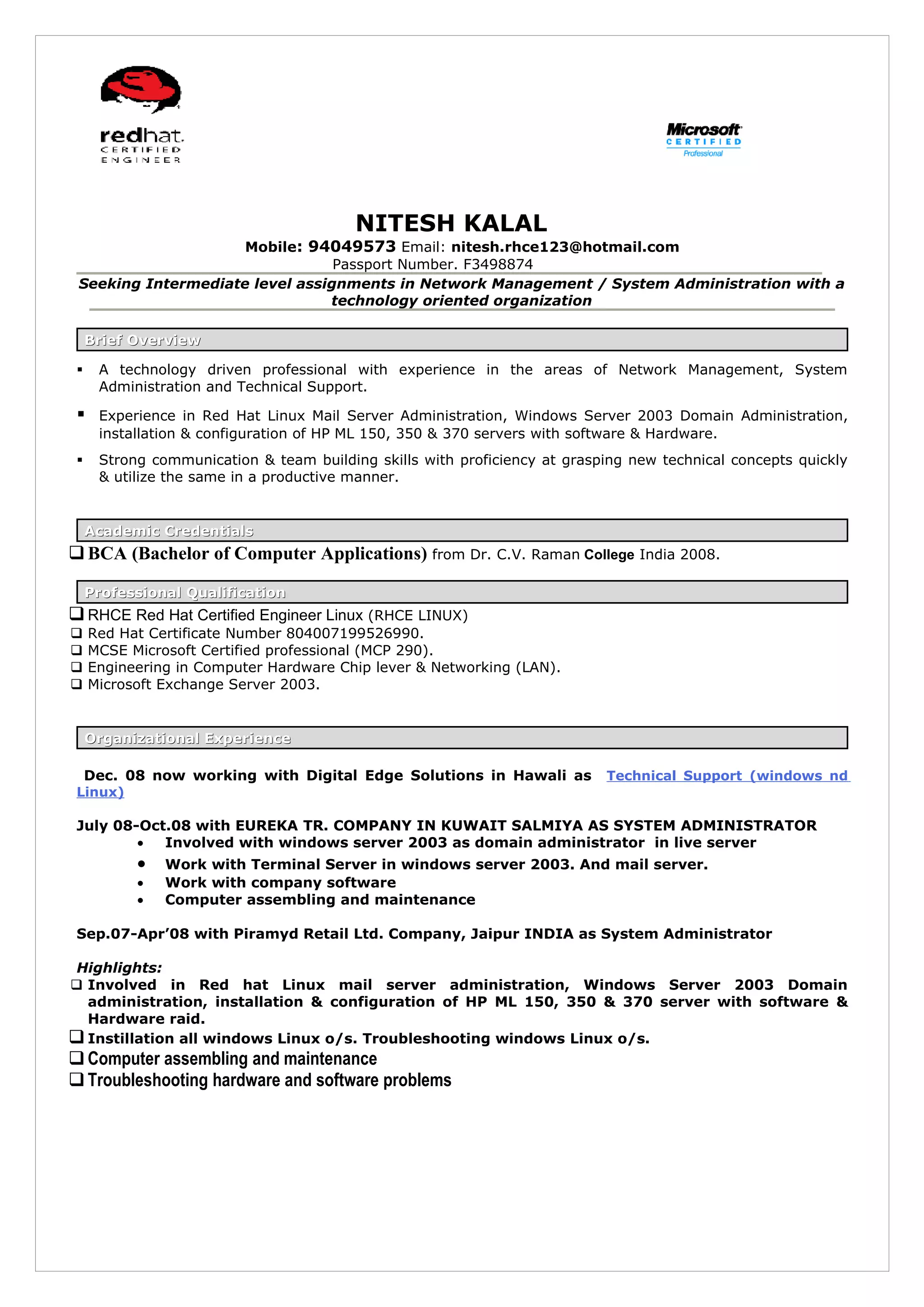 Nitesh Kalal is seeking an intermediate level position in network management or system administration. He has experience administering Red Hat Linux mail servers, Windows Server 2003 domains, and installing/configuring HP servers. He has a BCA from Dr. C.V. Raman College in 2008 and holds RHCE and MCSE certifications. His professional experience includes positions as a system administrator and technical support specialist in Kuwait and India from 2007 to present.