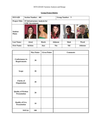 This document outlines the statement of work and project scope for analyzing GMC Investments' IT infrastructure. The current systems for TABC reporting, scheduling, and inventory management are manual, time-consuming, and error-prone. The project objectives are to streamline these systems by automating reporting, integrating pricing data, and directly capturing sales data to reduce errors and speed up reporting. The project will analyze GMC's existing processes and design automated interfaces for staff to record inventory, sales, and scheduling data into a centralized database for reporting.