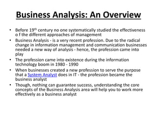 The document discusses the history and development of business analysis as a profession. It emerged in the 1980s-1990s during the information technology boom, as businesses needed a new way to analyze changes brought about by advances in information management and communication. The document outlines the key knowledge areas, responsibilities, and skills of business analysts. It also discusses the relationship between business analysts and project managers, and provides resources for further reading.