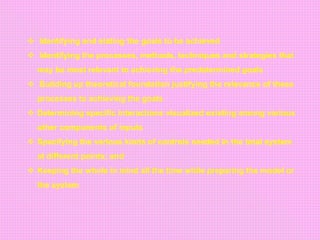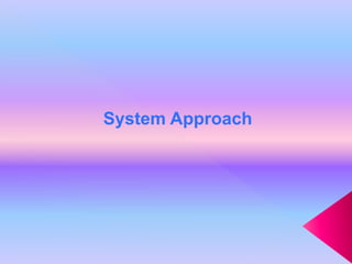 The document outlines the system approach, which involves identifying goals, relevant processes and methods to achieve those goals, building a theoretical foundation, determining interactions between components, specifying necessary controls, and considering the whole system. It then discusses how the system approach brings a scientific method to solving educational administrative problems and is a systematic way of designing an effective and economical educational system by regarding education as a system. Finally, it categorizes systems as natural, man-made, or combinations of natural and man-made.