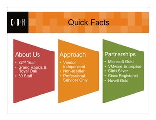 CDH, a Microsoft Gold partner, specializes in System Center Configuration Manager (SCCM) and mobile device management, with a comprehensive service offering in system management, application management, and endpoint protection. The document outlines the features and capabilities of SCCM 2012, including its integration with Active Directory and services for hardware and software inventory, application deployment, and remote management. Additionally, it highlights CDH's expertise, accolades, and contact information, indicating engagement with emerging trends like mobile device management.