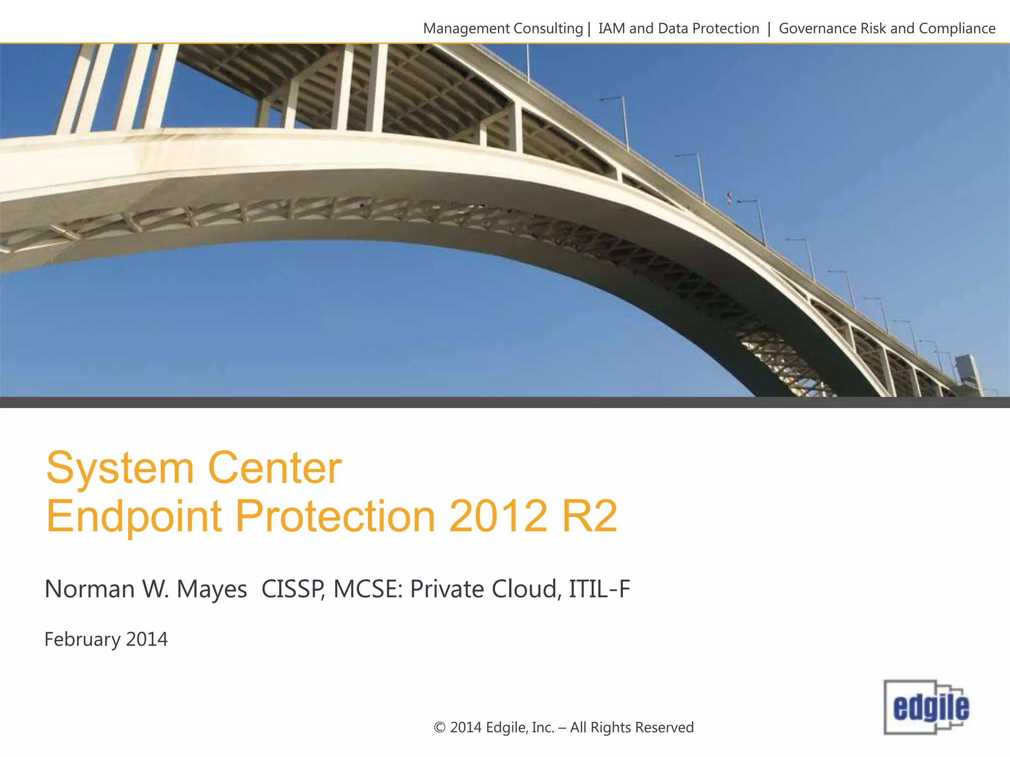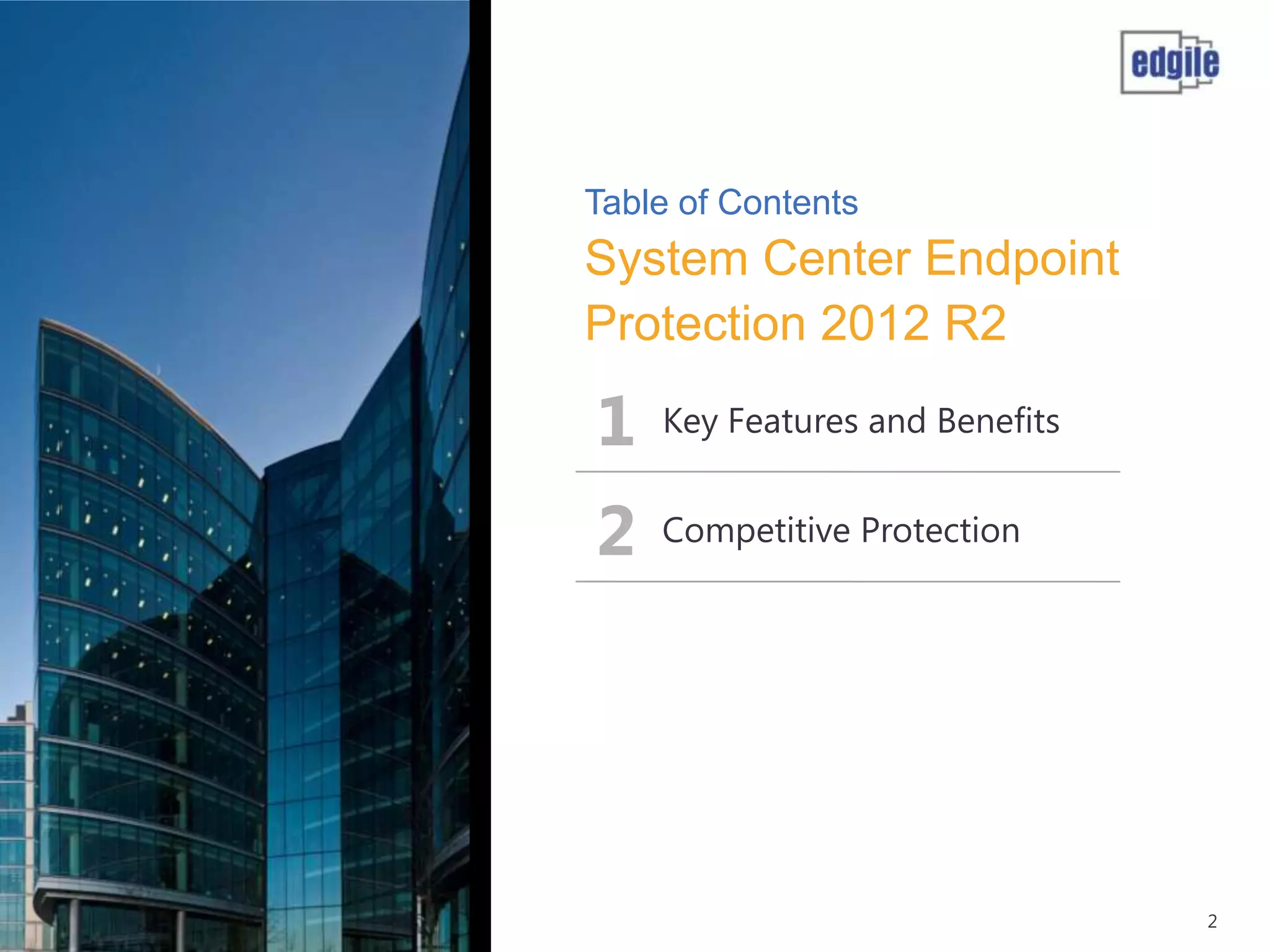 System Center Endpoint Protection 2012 R2 provides comprehensive malware protection and simplified administration capabilities. It features a common antimalware platform across Microsoft clients, proactive protection against known and unknown threats through endpoint inspection, and support for heterogeneous platforms including Windows, Mac, and Linux. While it faces some challenges from competitors like Trend Micro in testing scores and feature breadth, Microsoft leverages other Windows security features and benefits from its large malware sample collection through consumer products.