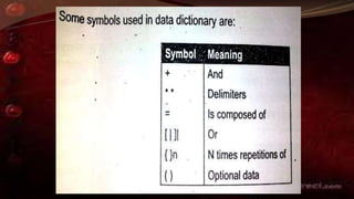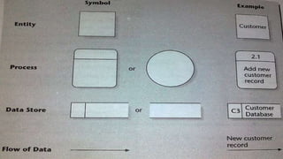 This document discusses tools and techniques for system design, including logical data flow diagrams (DFDs) and data dictionaries. DFDs use simple graphical symbols to represent processes, data flows, external entities, and data stores in a system. They provide an overview of how data moves through a system. A data dictionary comprehensively defines all data elements in a system. Physical design and prototyping are also discussed as part of specifying hardware, software, user interfaces, and the overall implementation of a system.