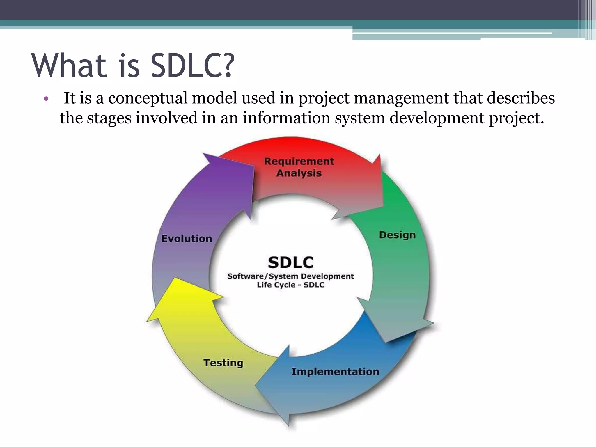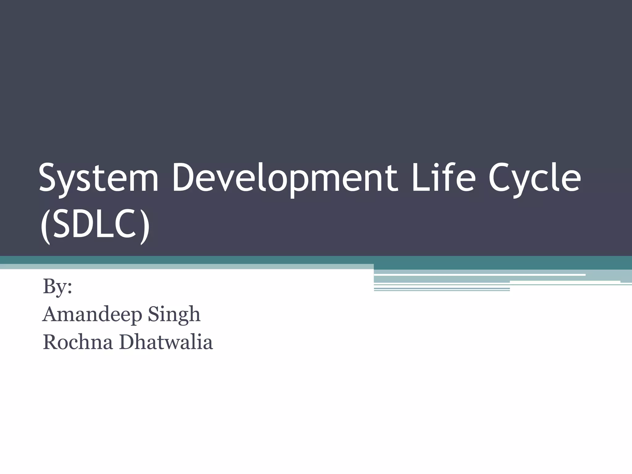 The document discusses the system development life cycle (SDLC), which describes the stages of an information system development project. It outlines the typical stages: recognition of need, feasibility study, analysis, design, implementation, post-implementation, maintenance, and prototyping. The feasibility study assesses the economic, technical, and behavioral factors. Analysis involves gathering requirements through tools like interviews and documentation. Design defines technical specifications and system flow. Implementation deploys the system. Prototyping allows refining the system through iterative testing and user feedback before final implementation.