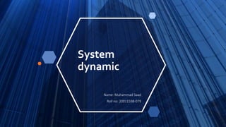 System dynamics is a methodology used to model and analyze complex systems over time. It helps researchers understand how different components within a system interact and how changes in one component can affect the entire system. The key benefits of system dynamics modeling include capturing dynamic behavior, exploring long-term trends, representing feedback loops and nonlinear relationships, performing iterative refinement, and assessing risks. However, creating and understanding system dynamics models can be complex, models often require significant data, and certain system aspects may be outside the model's scope. AnyLogic software allows implementing system dynamics models through stocks, flows, variables, equations, simulations, results analysis, and iterative refinement.
