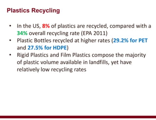 This document summarizes a presentation on system dynamics modeling of plastics recycling scenarios. It finds that increased plastics recycling could provide environmental benefits but price variability and volume constraints limit potential for new plastics processing in Minnesota. Rigid plastics and film plastics represent good opportunities for higher diversion from landfills. The presentation included system diagrams, data on plastics recycling rates and prices, and preliminary results from recycling capacity scenarios modeling changes over time.