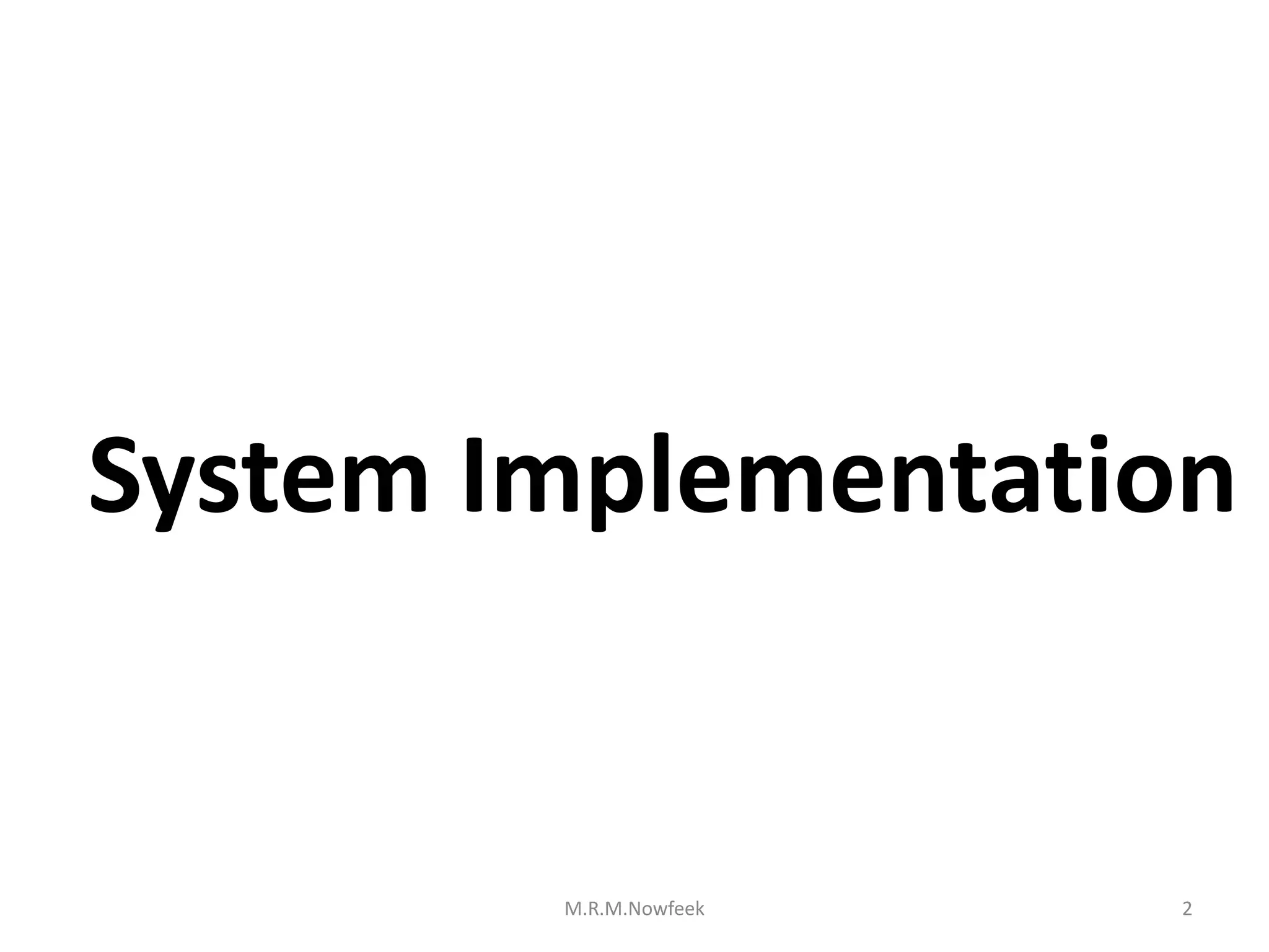 1. System implementation involves source code, database, user documentation, testing, staff training, and file conversion.