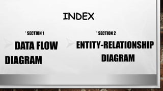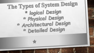 This document discusses various types of diagrams and design phases used in software development lifecycle. It describes entity-relationship diagrams, data flow diagrams, logical design, physical design, architectural design, detailed design, testing strategies, unit testing, integration testing and functional testing. The key aspects covered are modeling entities and relationships, inputs/outputs, data flows, user requirements, interfaces, processes, databases and testing at different stages of development.