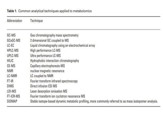 1. Systems biology involves iterative experiments, technology development, theory, and computational modeling to understand biological systems. Metabolomics analyzes the complete set of metabolites in a system and can help reconstruct metabolic networks and identify biomarkers of disease.
