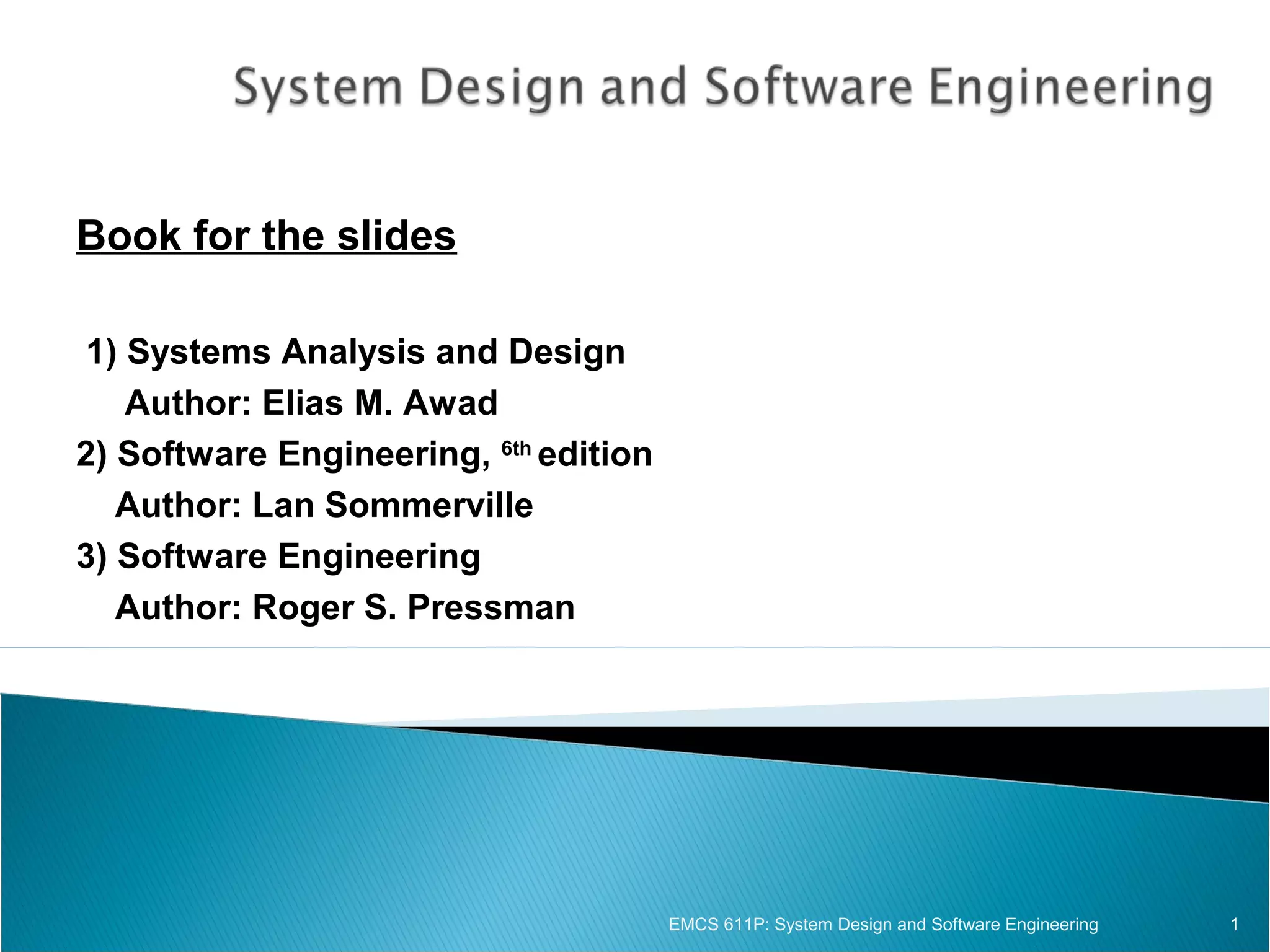 Book for theslides 1) Systems Analysis and Design Author: Elias M. Awad 2) Software Engineering, 6th edition Author: Lan Sommerville 3) Software Engineering Author: Roger S. Pressman EMCS 611P: System Design and Software Engineering 1