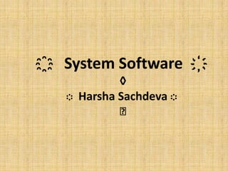 The document summarizes different types of system software, including system control programs like operating systems (OS), system support programs like utility programs, and system development programs like language translators. It describes the main functions of each type of system software - OS manage computer resources and perform functions like memory, processor, and file management, utility programs provide common services like sorting and copying data, and language translators convert programs between languages like assemblers converting to machine code.