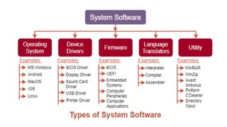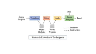 The document discusses system software and its key components. It defines system software as programs that manage computer hardware resources and provide a platform for other software. It describes common types of system software like operating systems, assemblers, compilers, linkers, loaders, and interpreters. It explains the functions of these components like memory management, process scheduling, translation between assembly and machine language, and linking of programs.