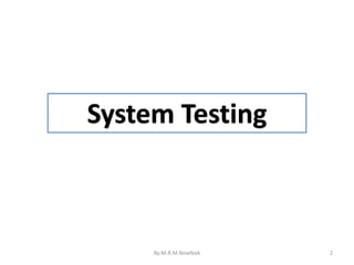 2. There are different types of testing including unit testing, integration testing, system testing, and user acceptance testing. Unit testing is done by developers, while later tests involve independent testers.