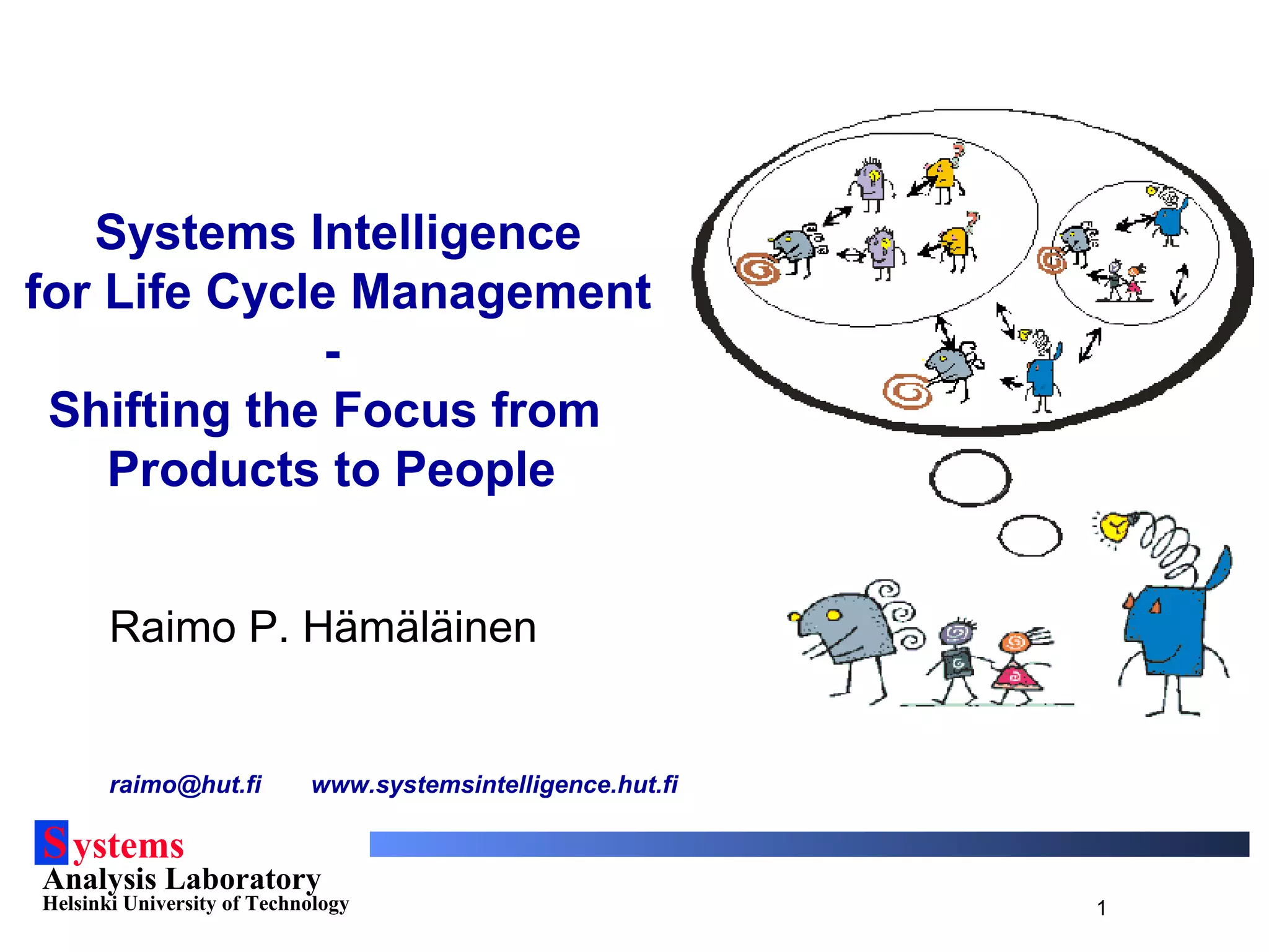 This document discusses systems intelligence and its application to life cycle management. It defines systems intelligence as understanding oneself as part of a complex system and being able to act intelligently within that system. The document outlines five steps in developing systems intelligence capability. It argues that systems intelligence can help shift the focus of life cycle management from products to people by viewing life cycle management through a systems thinking lens and making human thinking the driver for improvement.