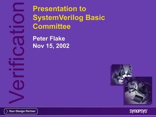 The document presents a verification presentation on SystemVerilog concepts such as interfaces, instantiation syntax, logic types, and type usage. It emphasizes the differences between modules and interfaces, procedural and structural communication, and introduces various types and their implications in design. Additionally, it covers new features like 'always_comb' for combinational logic and details on time data types, constants, and syntax requirements.