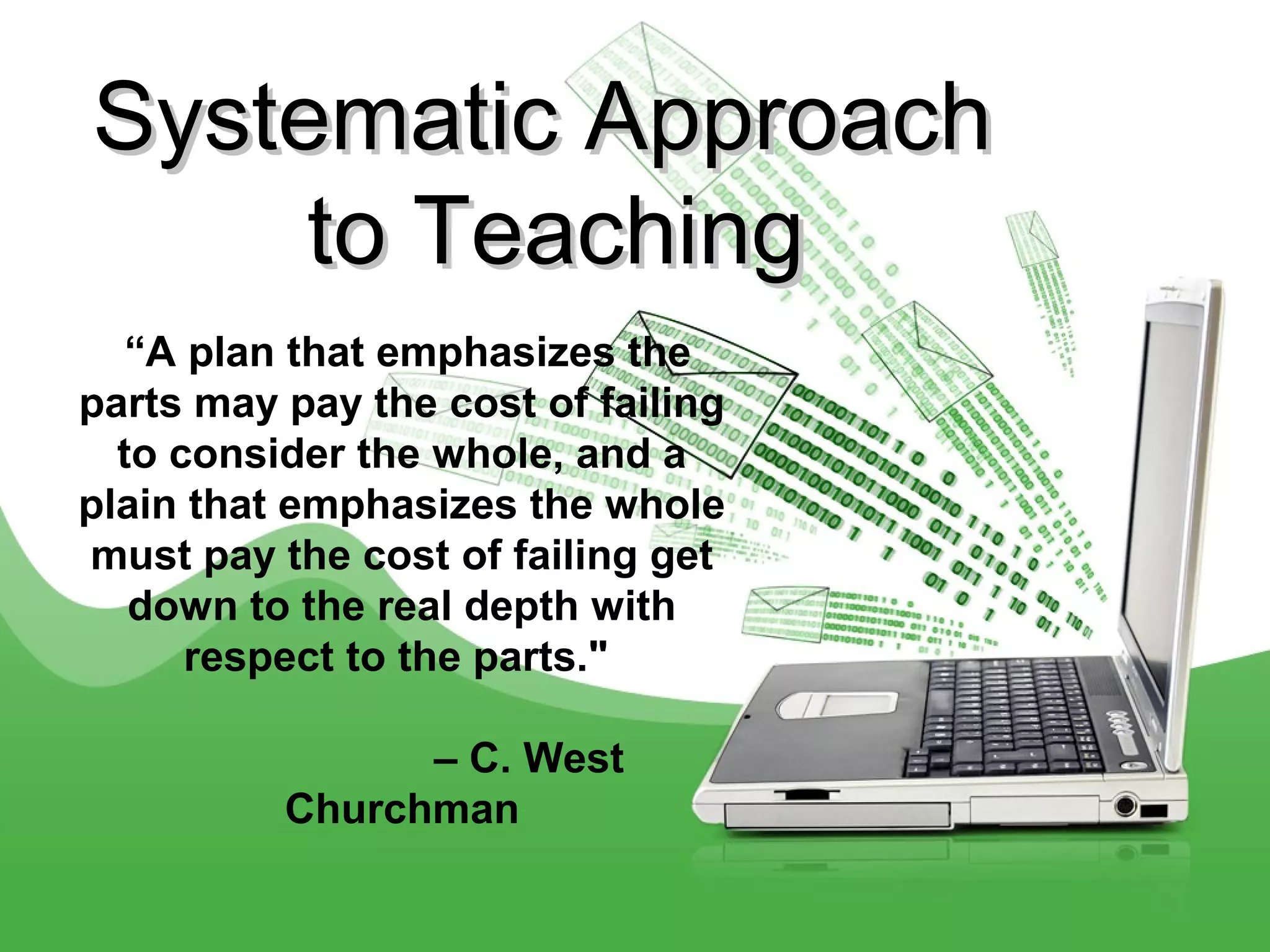 The systematic approach to teaching views the entire educational program as an interconnected system. It involves carefully planning all aspects of instruction including objectives, teaching methods, learning experiences, materials, and assessment. The key phases are to define objectives based on student needs, select appropriate teaching methods and experiences, implement the instruction as planned, and evaluate outcomes to determine if objectives were achieved or if revision is needed. All elements of the instructional process must work together for learning to occur.