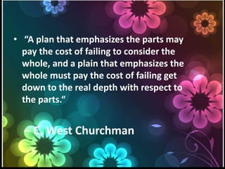 The document outlines the ASSURE model for systematic instructional planning. The ASSURE model involves 6 steps: 1) Analyzing the learner to define instructional objectives based on student needs, interests, and readiness, 2) Choosing an appropriate teaching method based on the objectives, 3) Selecting learning materials, equipment and facilities suited to the method, 4) Assigning roles to personnel to assist with resources, 5) Refining the process based on evaluation of outcomes, and 6) Choosing appropriate learning experiences to attain the objectives. The model emphasizes defining objectives based on students and selecting aligned methods, materials and roles to achieve the objectives.