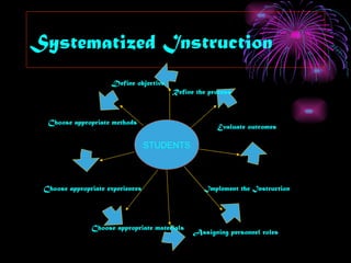 The document describes a systematic approach to teaching called Systematized Instruction. It involves defining instructional objectives, refining the teaching process, choosing appropriate teaching methods and materials, implementing instruction, assigning roles, and evaluating outcomes with the focus being on students.