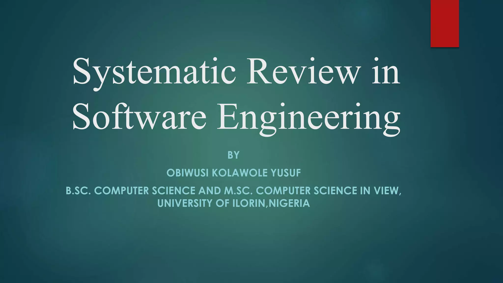 This document outlines the key aspects of systematic reviews and discusses their application in software engineering. It defines systematic reviews as a methodology used to gather and evaluate available evidence on a focused topic. The document notes advantages like reducing biases and identifying gaps, and disadvantages like requiring more effort than traditional reviews. Finally, it presents a five-step template the author developed for conducting systematic reviews in software engineering to help address issues like fragmentation and lack of standards in the field.