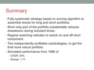 This document describes a systematic stock picking strategy that combines long and short portfolios. It uses a scoring algorithm to select stocks and a regime switching indicator to determine when to include the short portfolio. Simulated backtested performance from 1996-2013 shows an annual return of 30% and Sharpe ratio of 1.71, significantly outperforming the S&P 500 over that period with lower maximum drawdowns.