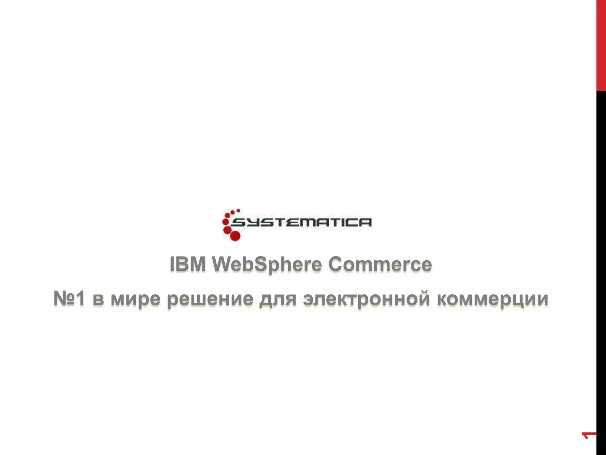 IBM WebSphere Commerce является ведущей платформой для электронной коммерции, обеспечивая значительные обороты для интернет-ритейлеров и устойчивое лидерство на рынке. Документ описывает преимущества платформы, возможности многоканальной реализации, а также примеры функциональности, которая позволяет бизнесам взаимодействовать с клиентами и увеличивать продажи. Электронная коммерция рассматривается как комплексная система, охватывающая интеграцию различных каналов и технологий для оптимизации клиентского опыта.