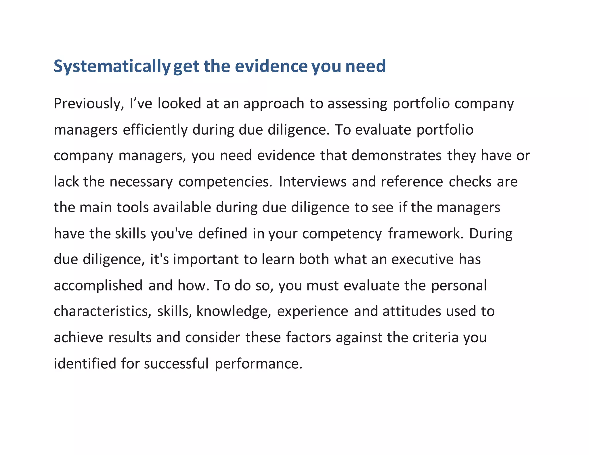 This document discusses efficient methods for assessing portfolio company managers during due diligence, emphasizing the importance of gathering evidence about their competencies through interviews and reference checks. It outlines the role of a competency framework in formulating interview guides that probe skills, personal characteristics, and experiences relevant to successful performance. Additionally, it highlights the ongoing evaluation and support needed for new management teams after hiring.
