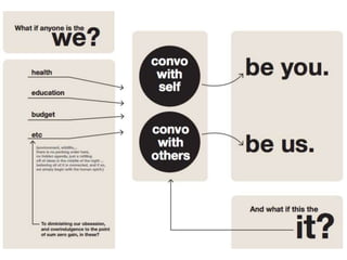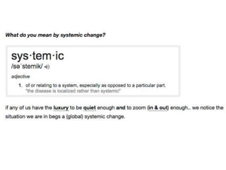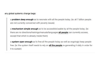 The document discusses how major man-made technologies are no longer serving us well and how we can now affect global systemic change beyond systems like education, economics, politics, and health. It argues that better options are available to render irrelevant things like work, school, money, politics, poverty, war, and that these better technologies have been available but policies and politics have gotten in the way. The document suggests it is time to model another way and that once we start questioning things, there is no going back, and that we have all we need to get started, proposing starting with freeing artists.