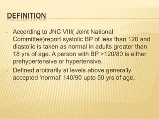 The document provides a comprehensive overview of systemic hypertension, detailing its definitions, classifications, causes, clinical features, complications, investigations, and management strategies. It categorizes hypertension into primary and secondary forms while explaining various symptoms and potential complications linked with high blood pressure. Treatment options include lifestyle modifications and a range of pharmacological interventions such as ACE inhibitors, beta blockers, and diuretics, along with specific management for conditions like malignant and resistant hypertension.