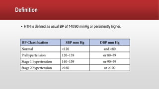 Systemic hypertension is defined as a usual blood pressure of 140/90 mmHg or higher. It doubles the risk of cardiovascular diseases and is a leading cause of death worldwide. There are two main types - primary/essential hypertension which accounts for 95% of cases and has no identifiable cause, and secondary hypertension which is caused by specific conditions like kidney disease or hormonal disorders. Untreated hypertension can lead to serious complications affecting the heart, brain, kidneys and eyes. Management involves identifying and treating any underlying causes, along with lifestyle modifications and medication to control blood pressure.