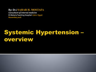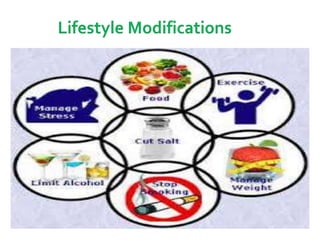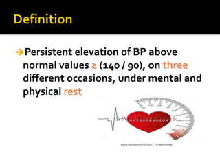 This document outlines the classification and management of hypertension (HTN), including definitions, stages, and treatment protocols. It emphasizes the importance of accurate blood pressure assessment, risk stratification, and identifying secondary causes, while also detailing lifestyle modifications and medication options for treatment. The document serves as a comprehensive guide for healthcare professionals in managing patients with high blood pressure.