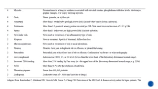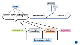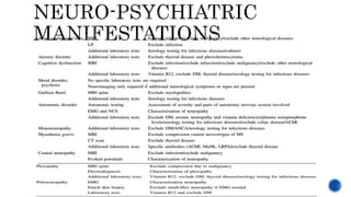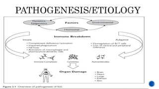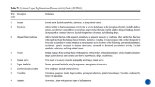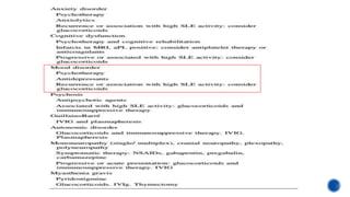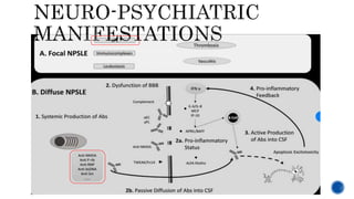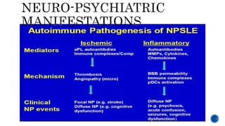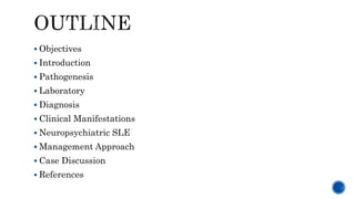 This document provides an overview of systemic lupus erythematosus (SLE) and neuropsychiatric SLE (NPSLE). It discusses the pathogenesis, epidemiology, classification, clinical manifestations, diagnosis, and management approaches for NPSLE. Regarding management, it describes general treatment approaches as well as specific therapies aimed at inflammatory NPSLE such as corticosteroids, immunosuppressants, and intravenous immunoglobulin. It also covers primary and secondary prevention strategies as well as treatments targeting ischemic events like antiplatelet agents and anticoagulants.