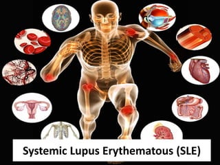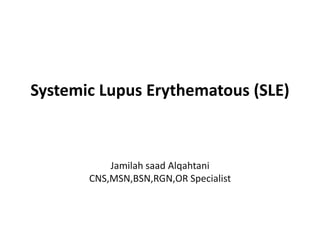 The document presents a case study of a 41-year-old Saudi female patient diagnosed with systemic lupus erythematosus (SLE) and chronic kidney disease (CKD), detailing her treatment journey including plasmapheresis and renal biopsy. It discusses SLE's pathophysiology, types, diagnostic criteria, and ongoing management therapies such as continuous renal replacement therapy. Additionally, it outlines pharmacological treatments, symptomatology, and nursing care approaches tailored to managing chronic pain, activity intolerance, and cardiac output issues related to SLE.