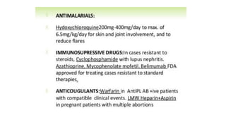 Systemic lupus erythematosus (SLE) is a chronic autoimmune disease that can affect various organs in the body. Common symptoms include fatigue, joint pain, rashes, and kidney problems. It is caused by genetic and environmental factors that lead to abnormal immune responses against the body's own tissues. Diagnosis involves evaluating clinical features along with blood tests to detect autoantibodies. Treatment depends on the specific organs involved but may include medications to suppress the immune system.