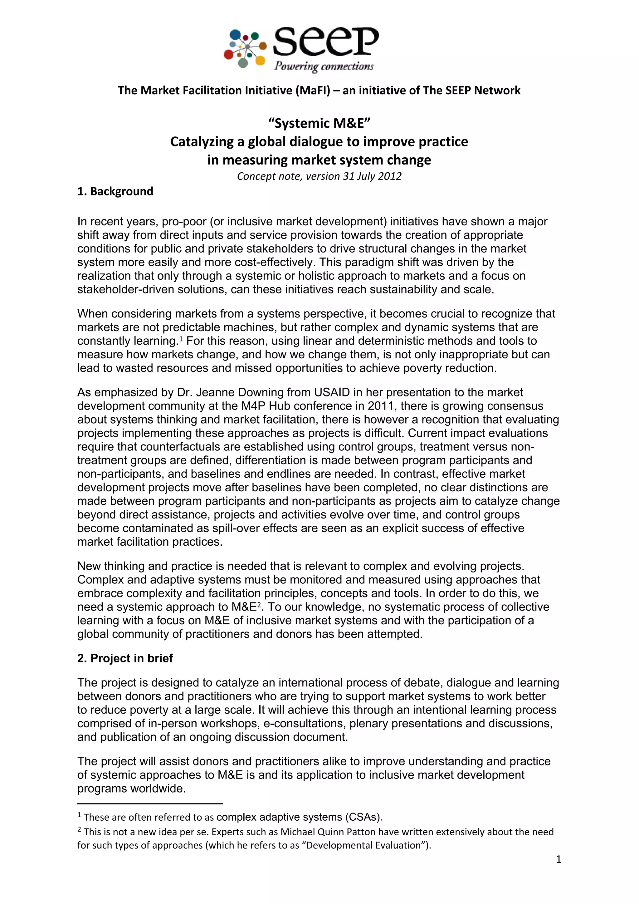 The Market Facilitation Initiative (MAFI) aims to enhance the practice of measuring market system change by fostering a global dialogue among donors and practitioners focused on inclusive market development. It emphasizes the need for a systemic approach to monitoring and evaluation (M&E) that aligns with the complexity of market systems rather than traditional linear methods. Key activities include workshops, e-consultations, and the publication of discussion documents to facilitate understanding and application of these systemic M&E approaches.