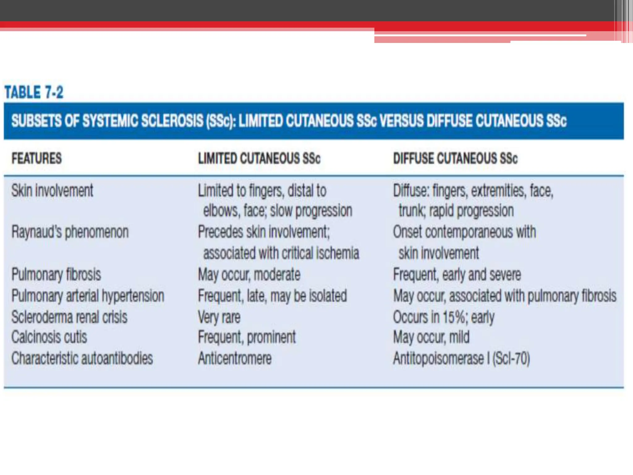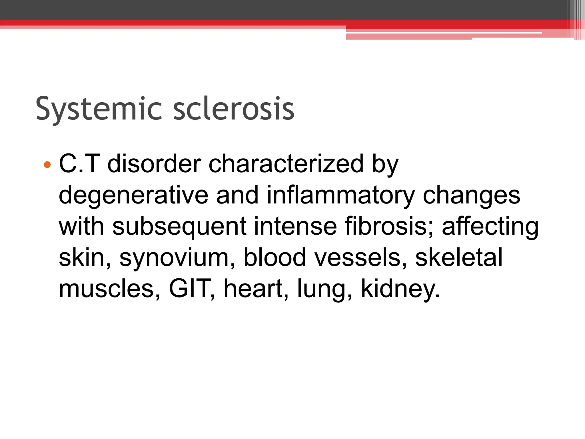 Systemic sclerosis is a connective tissue disorder characterized by fibrosis affecting multiple organs, including the skin, lungs, heart, and kidneys, with a complex etiology involving genetic and environmental factors. The disease can present in various forms, such as limited and diffuse cutaneous scleroderma, and may lead to serious complications in multiple organ systems including vascular, gastrointestinal, pulmonary, renal, and cardiac involvement. Diagnosis often involves serologic tests and capillary microscopy, while treatment options include immunosuppressives, calcium channel blockers, and supportive measures aimed at managing specific symptoms and complications.