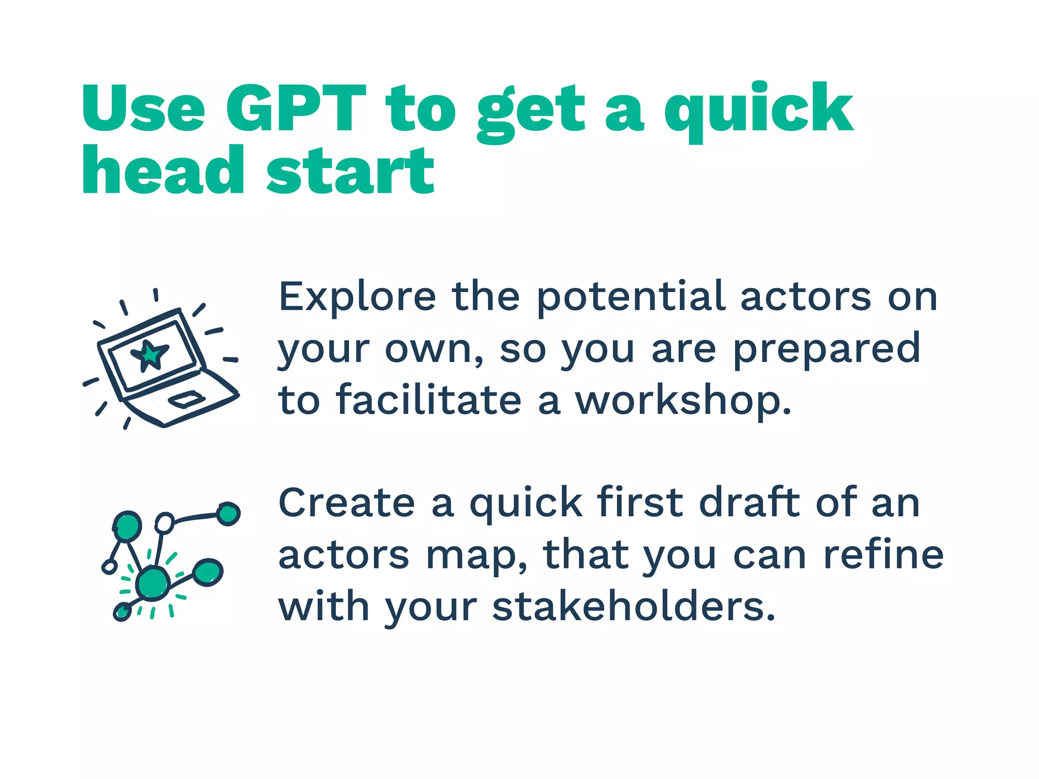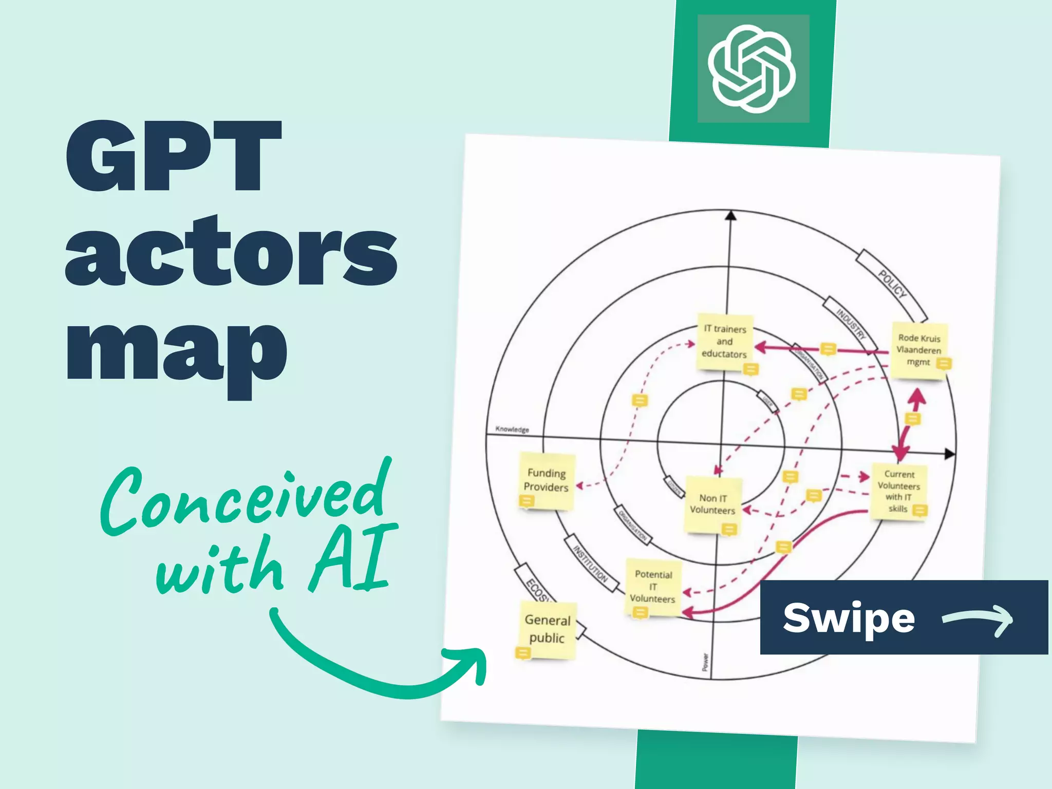 The document outlines a process for creating an actors map for a volunteer-driven app team for the Belgian Red Cross using AI prompts. It describes a series of five prompts that guide the user in identifying actors, related initiatives, and their relationships, ultimately assisting in visualizing the dynamics within the system. The approach aims to prepare facilitators for engaging stakeholders in a workshop setting.