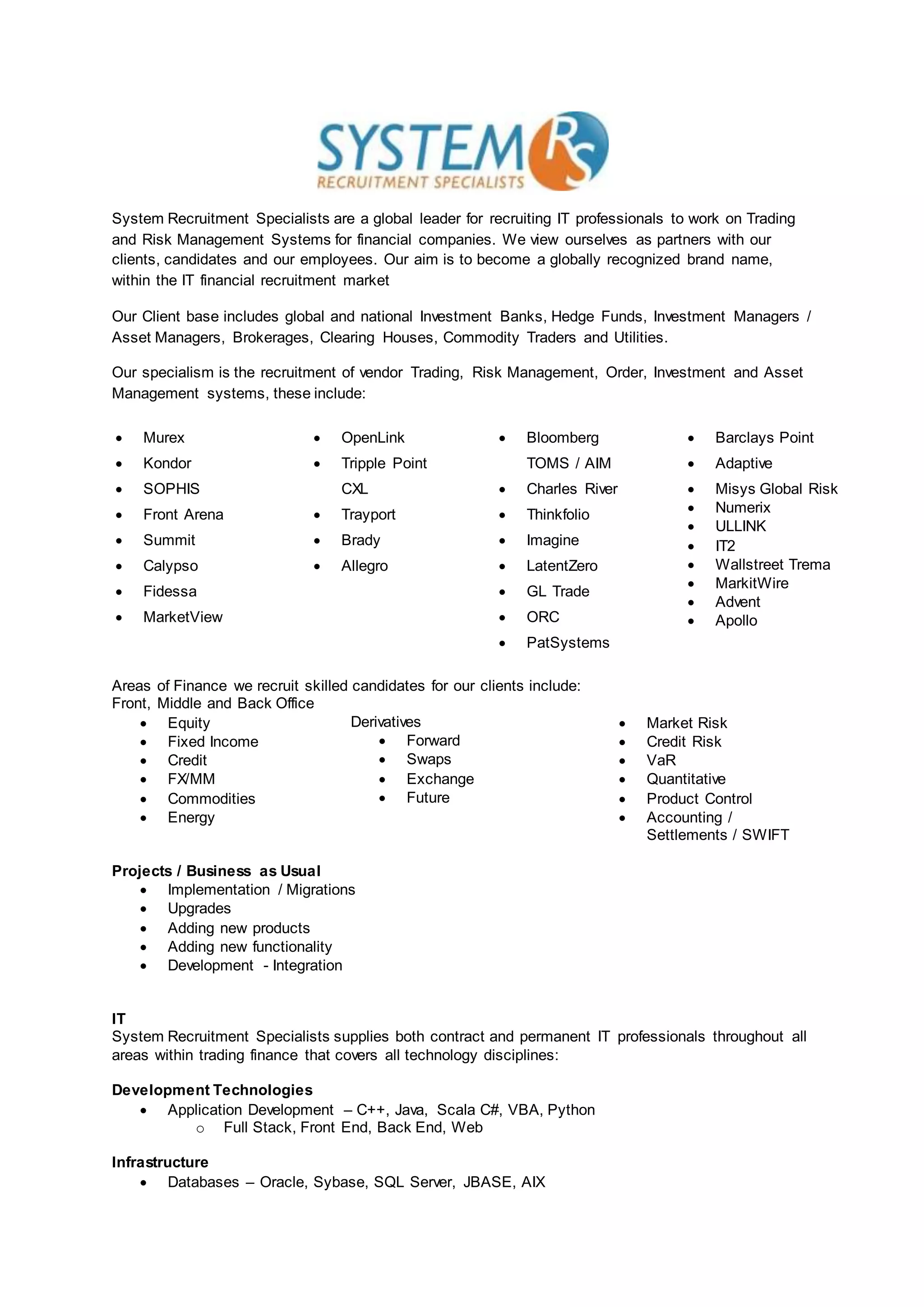 System Recruitment Specialists is a global recruitment firm that specializes in placing IT professionals in trading and risk management roles for financial companies. They recruit candidates with expertise in various trading and risk management systems. Their client base includes investment banks, hedge funds, asset managers, and other financial institutions. The recruitment firm aims to build long-term partnerships with both clients and candidates by gaining an in-depth understanding of their needs and providing a personalized recruitment experience.