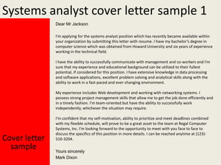 This ppt file provides materials for writing a cover letter for a systems analyst position, including two sample cover letters, tips for writing an effective cover letter, resume samples, interview questions, and other job application resources. The sample cover letters both address the hiring manager by name, mention relevant experience and qualifications for the systems analyst role, and request to schedule an interview. Additional materials include cover letter writing tips, resume examples, common interview questions and answers, and advice for job interviews.