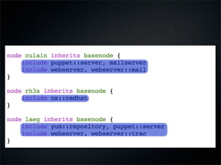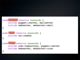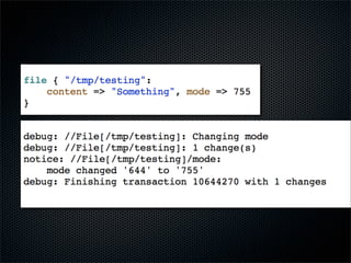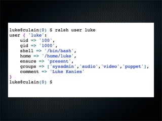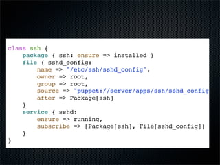 This document provides an overview of Puppet, an open source configuration management tool. It discusses how Puppet allows systems to be managed at scale through declarative configuration code. Resources in Puppet are abstracted and portable across operating systems. Puppet brings the benefits of idempotence and reproducibility to system administration tasks.