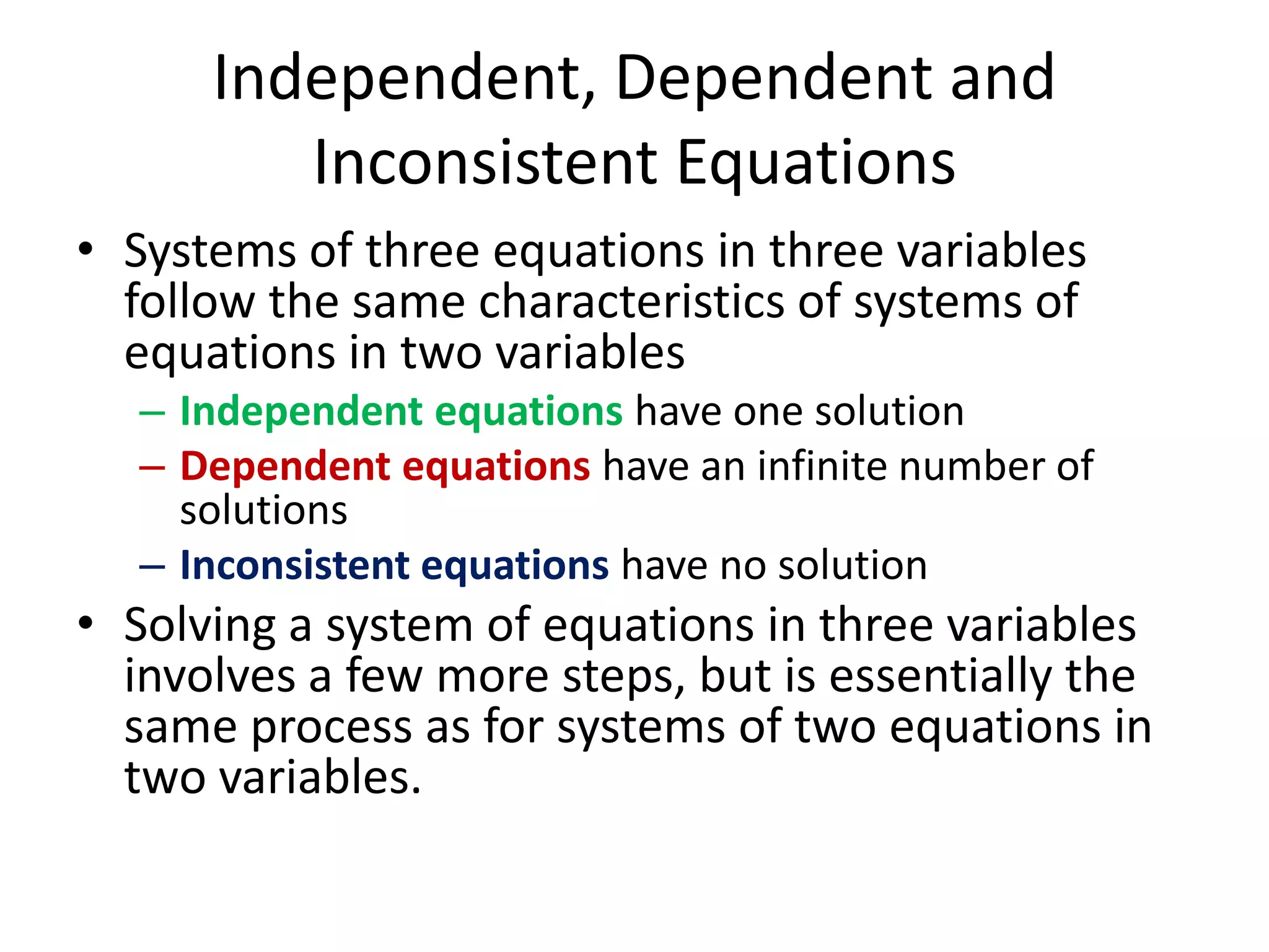 The document discusses solving systems of 3 linear equations with 3 variables. It provides steps to set up the equations in standard form, eliminate one variable using two equations, eliminate the same variable from another pair of equations to get a system of 2 equations with 2 variables, solve this system to find the values of two variables, substitute these values into the original third equation to solve for the remaining variable, and check the solution. An example problem demonstrates applying these steps to solve for x, y, and z. The summary notes that the solution may not be unique depending on whether eliminating variables results in a true or false statement.