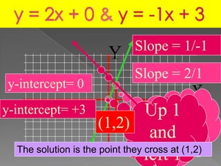 The document discusses two lines with slopes of 1/-1 and 2/1 that intersect at point (1,2). It also contains two parallel lines with a slope of 1/2 and y-intercepts of 1 and 3 to graph on a coordinate plane. Finally, it mentions that the equations Y=x+2 and Y=X+2 represent the same line and have infinitely many solutions including the point (1,2).